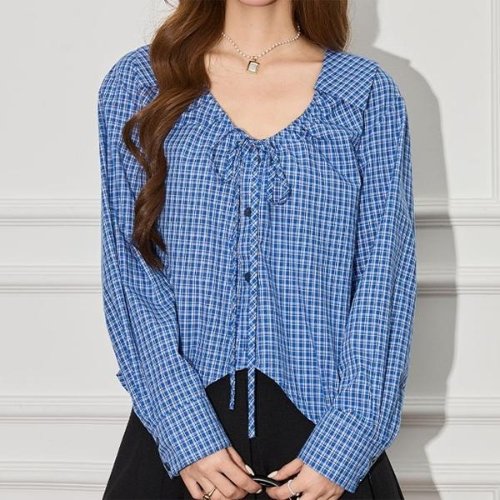 [패션시그널]리본스트링넥 체크패턴 블라우스 65F454