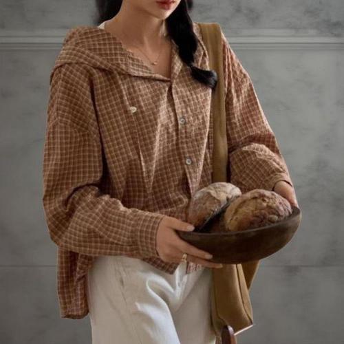 [옷자락] 여성 키치무드 컬러배색 체크 후드 스트링 면혼합 셔츠
