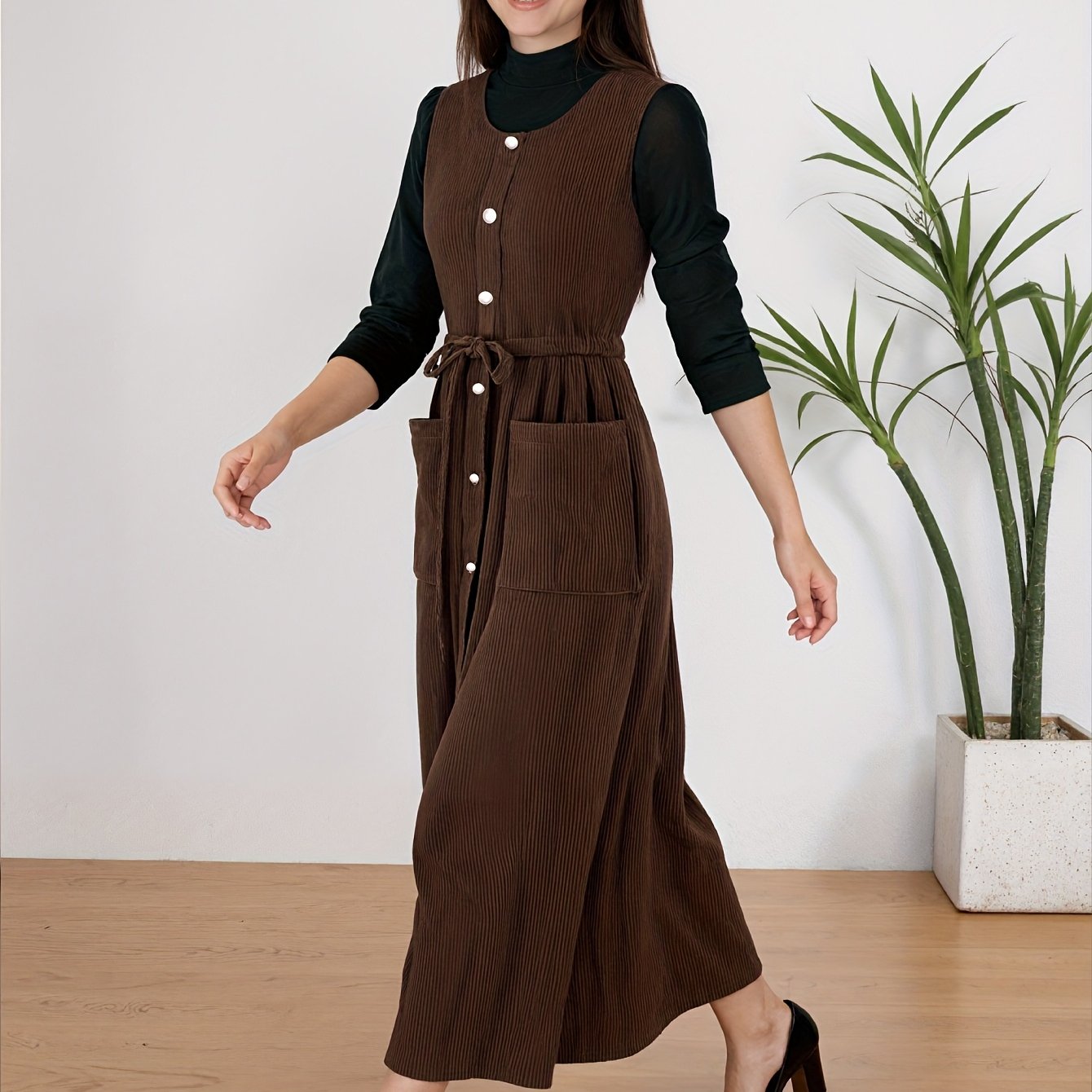 TEMU 2025년 가을 겨울 타이 허리 슬림핏 조끼 롱 드레스, 미디 길이 캐주얼 바캉스 드레스