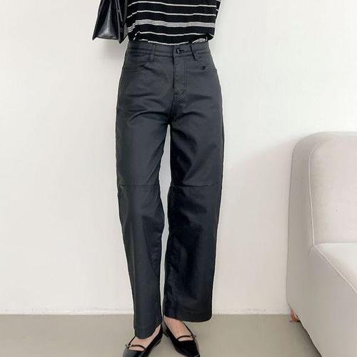 [옷자락] 여자 코팅 가죽팬츠 세미와이드 속밴딩 절개 스판 바지