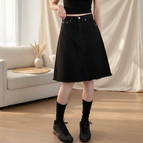 [옷자락] 여성 A라인 데님 미디스커트 5부 논스판 청치마