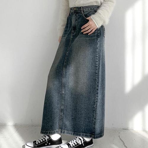 가비진 여성용 스판 워싱 데님 H라인 뒤트임 청치마 데님 스커트 롱스커트 치마