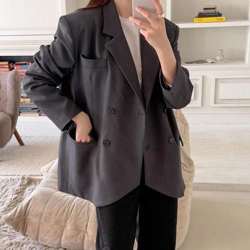 [옷자락]여자 박시핏 더블버튼 스판 카라넥 봄하객룩 포켓 자켓