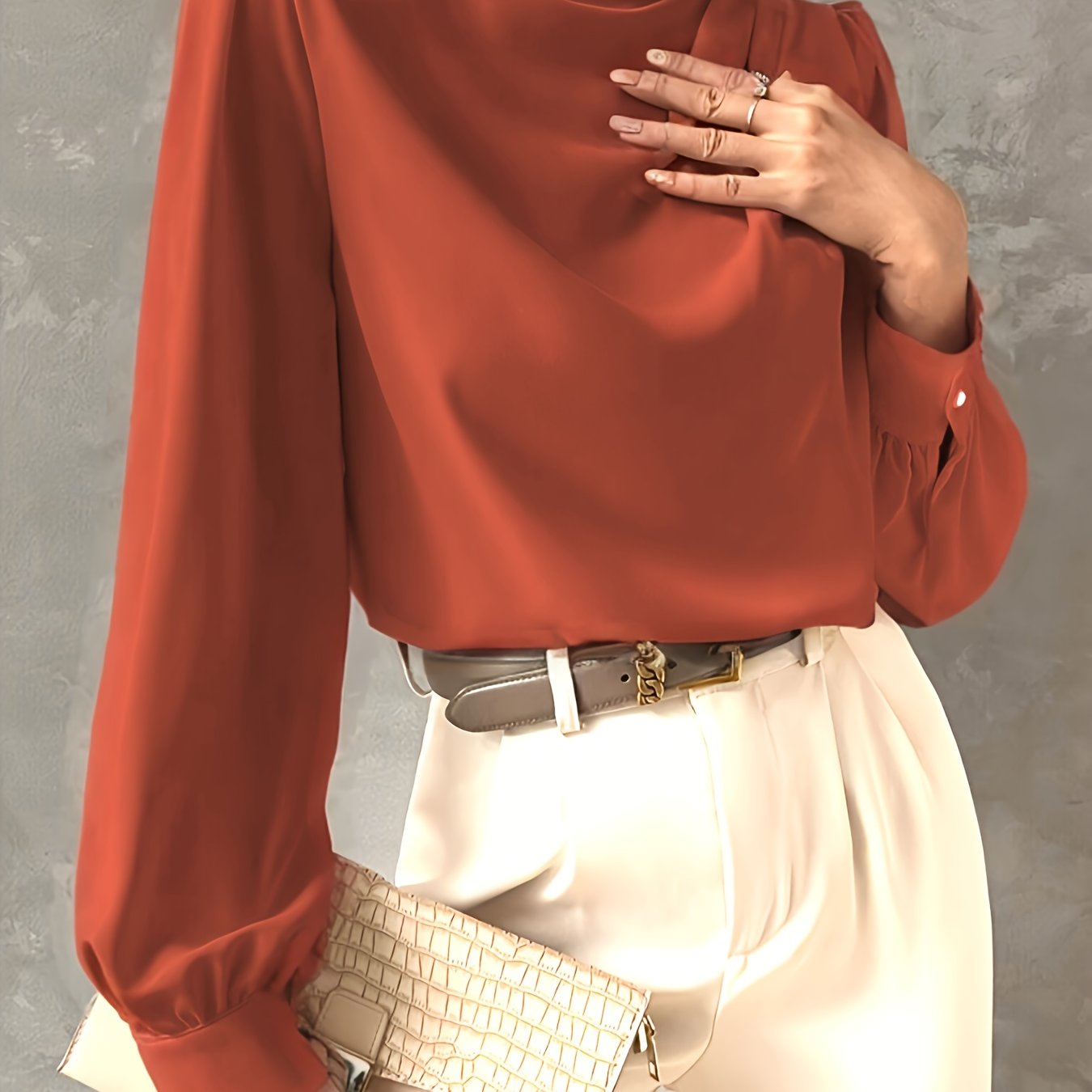 TEMU 여성을 위한 우아한 레드 브라운 셔츠. 루즈핏의 하이넥 디자인과 긴 소매가 특징이며, 스타일리시하고 다재다능한 오피스룩으로, 전문직과 캐주얼한 환경 모두에 적합합니다.