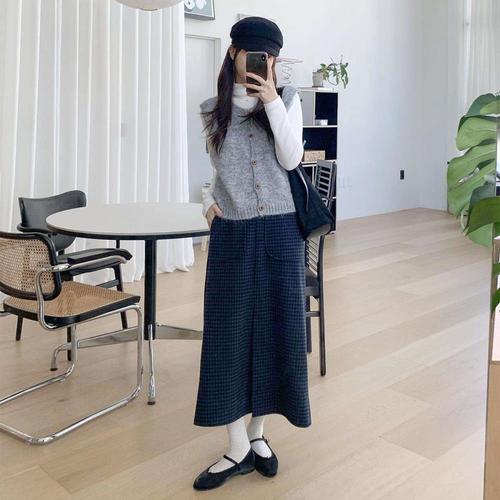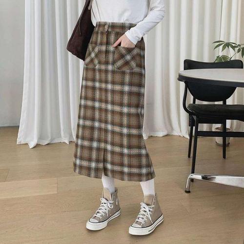 [다잇템]여성용 긴치마 슬릿 큰주머니 격자 디테일