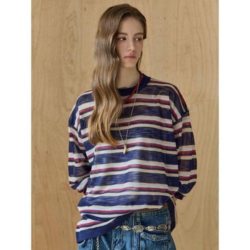 [마쟈]멀티 컬러 스트라이프 시스루 라운드넥 니트