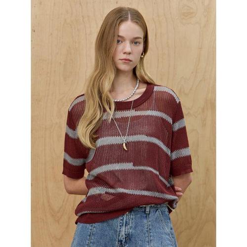 [마쟈]시스루 네트 스트라이프 라운드넥 반팔 니트