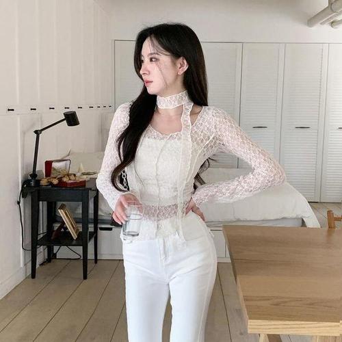 [옷자락]여성 봄 가을 시스루 레이스 머플러 세트 블라우스