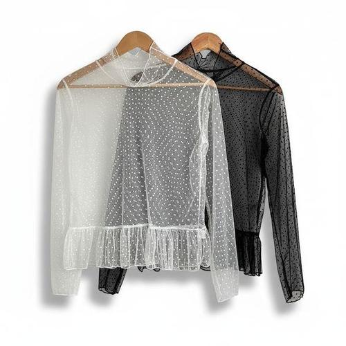 [신상오픈런]여성 도트 프릴 하이넥 시스루 박시 블라우스
