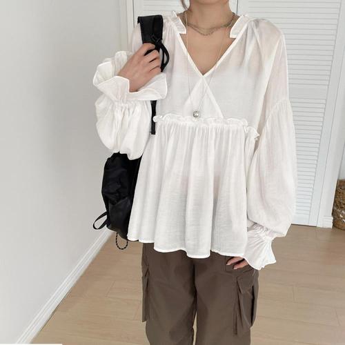 [SBD] 브이넥 심플 블라우스 시스루 프릴넥 블라우스