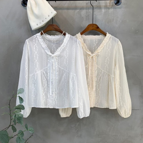 [옷자락]여성 시스루 자수 프릴 리본 퍼프소매 면 블라우스