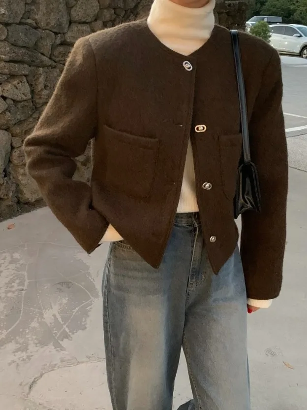 ChicAutumn 한국 스타일 빈티지 라운드 넥 더블 포켓 루즈 피트 긴 소매 모직 자켓 여성용 겨울 시즌 2023