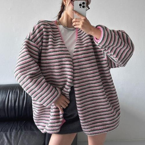 [다잇템][다잇템] 여자 큰사이즈 줄무늬 플리스 콘트라스트 V넥 FW 가디건_23853122_588872