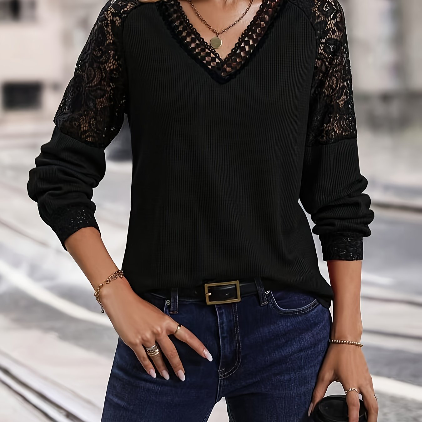 TEMU 여성용 우아한 블랙 레이스 V넥 슬림핏 래글런 긴팔 티셔츠 - A라인 실루엣의 대조적인 레이스 트림, 캐주얼 & 포멀을 위한 세탁기 사용 가능한 고탄력 소재, 봄/가을에 어울리는 다목적 이브닝웨어부터 정장까지, 솔리드 블랙과 레이스 소매, V넥 디자인, 패딩 없음, 편안하고 신축성 있는 단독 착용