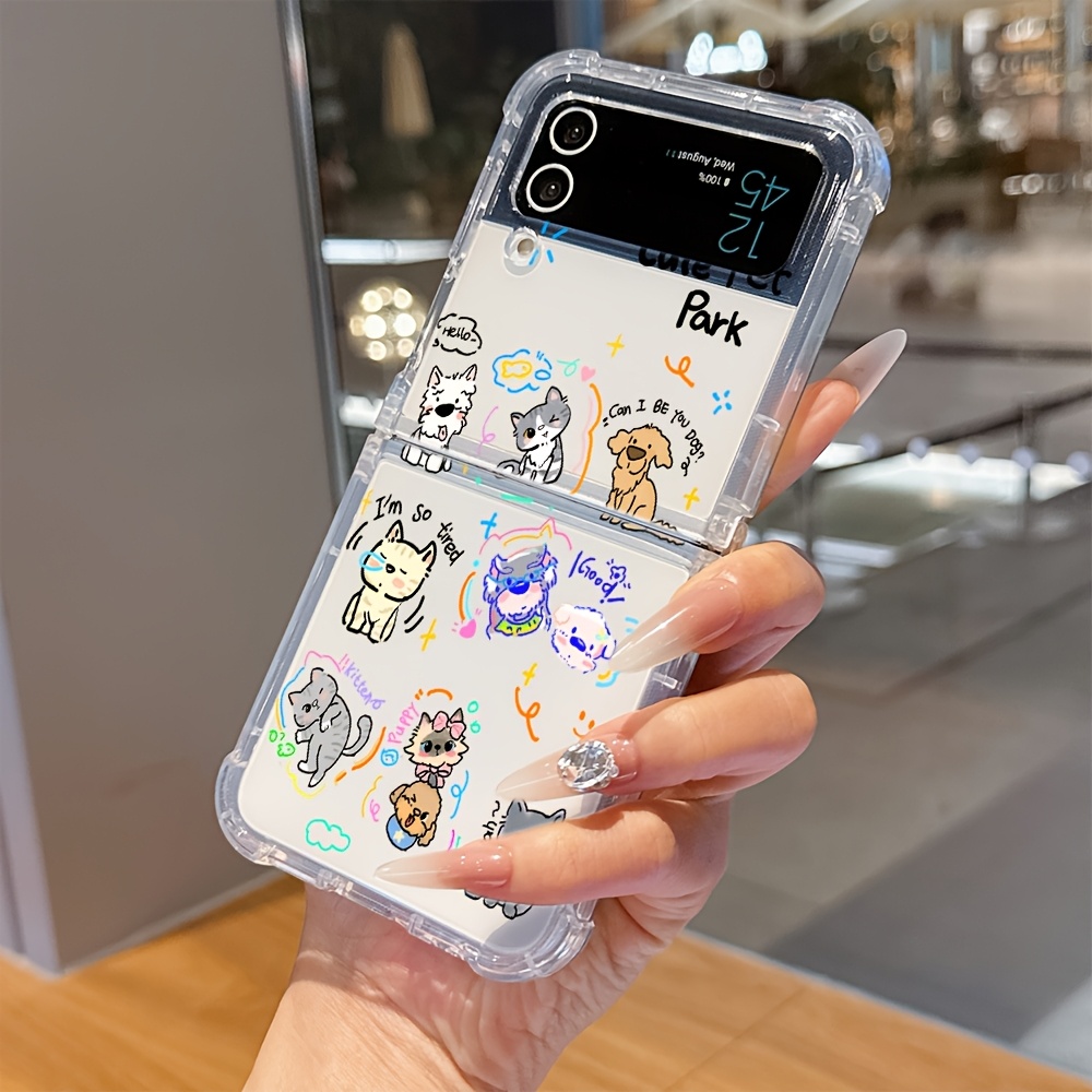 TEMU 귀여운 동물 고양이와 강아지 휴대폰 케이스 - 플립 3, Z 플립 4 호환 투명 소프트 백커버 (낙하 방지 기능)