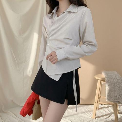심플 허리 스트랩 랩스타일 볼륨 블라우스