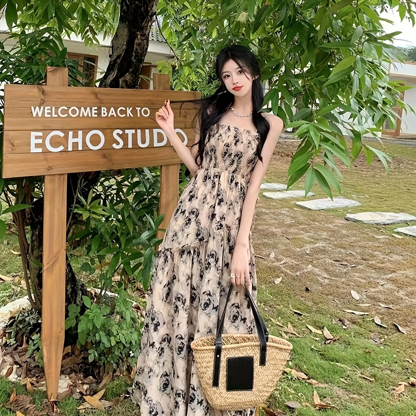TEMU 우아한 꽃무늬 프린트 맥시 드레스, 퍼프 슬리브, 사각 넥라인, 백리스 디자인 - 휴가 또는 데이트 나이트에 완벽, 봄/여름 컬렉션, 귀여운 드레스