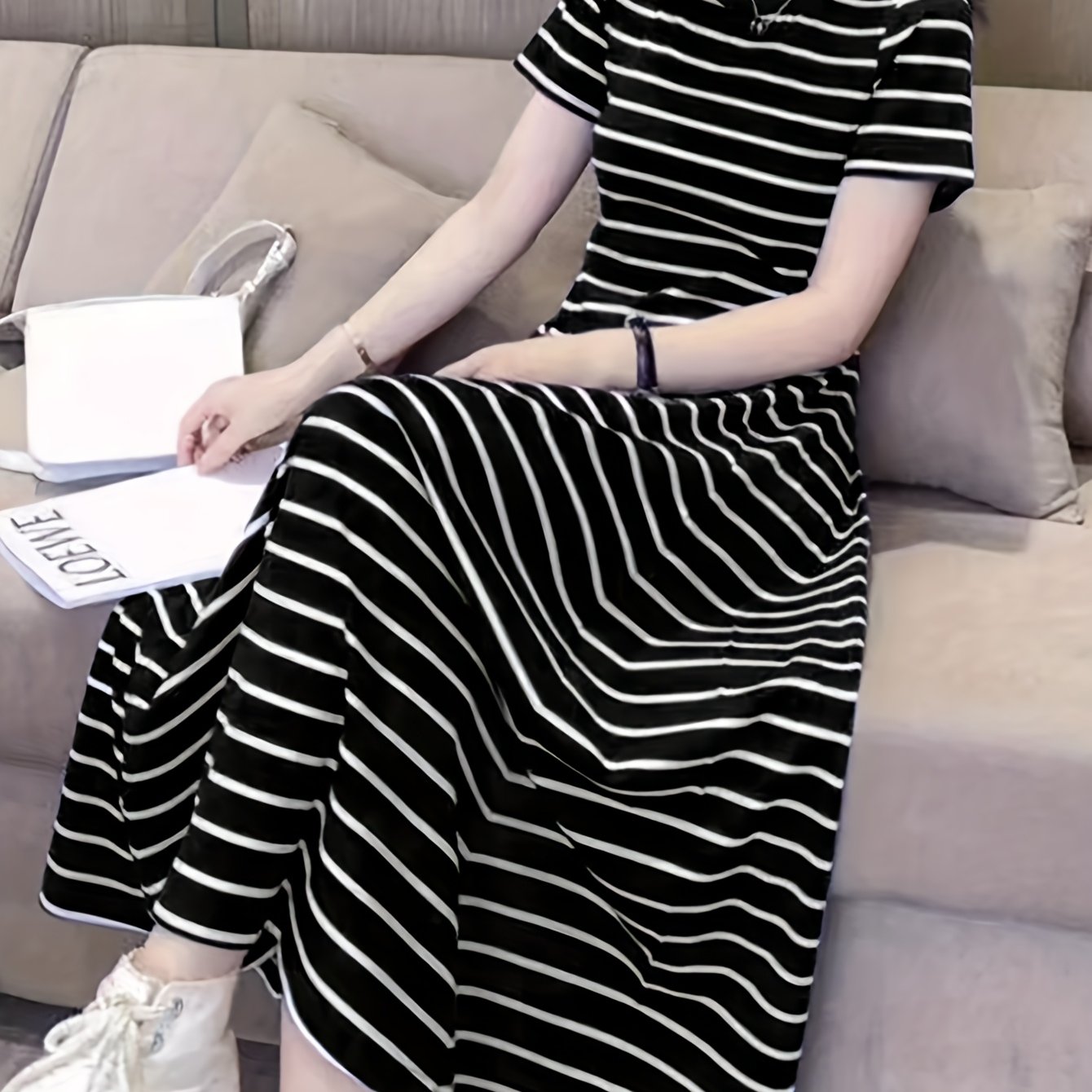 TEMU 여성용 프렌치 스타일 미디 드레스 - 사이드 슬릿, 2025 여름 컬렉션, 핏감 좋은 허리라인 & 라운드넥, 블랙 & 화이트 세로 줄무늬, 기계세탁 가능, 캐주얼부터 포멀까지, 봄 패션, 우아한 디자인, 통기성 소재, 오피스 웨어, 고품질 스티칭, 전문가용