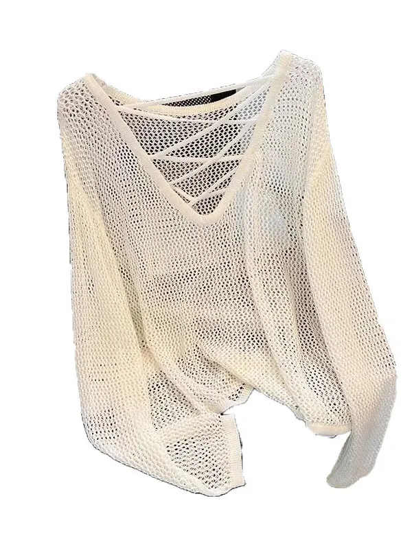 2025년 여름 여성용 아이스 실크 니트 홀로우 아웃 긴 소매 루즈 스타일 자외선 차단 커버업 트렌디 탑 한국 버전