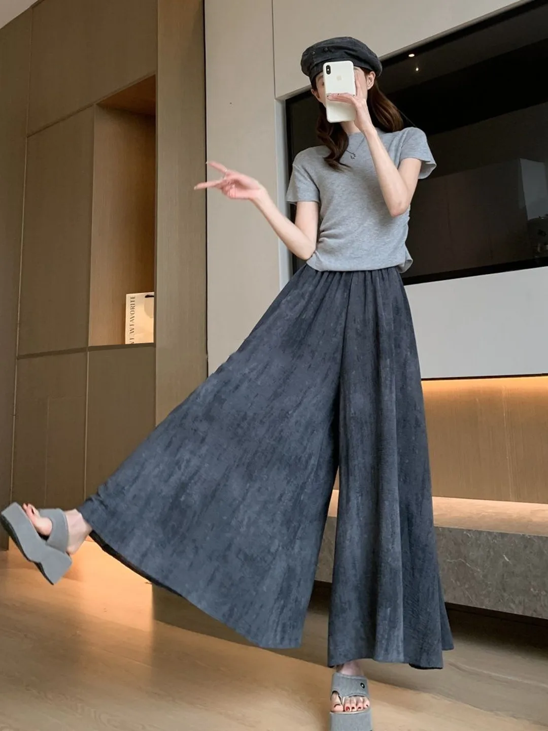 하이웨이스트 드레이프 아이스 실크 스커트 여성 여름 얇은 신상 와이드 레그 팬츠 한국 스타일 루즈핏 폴리에스터 섬유