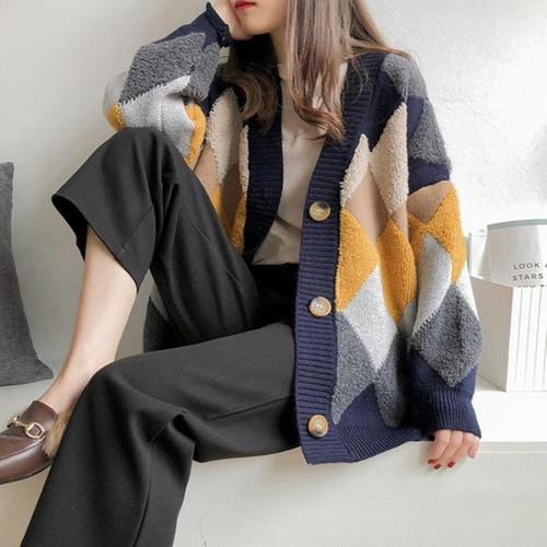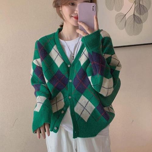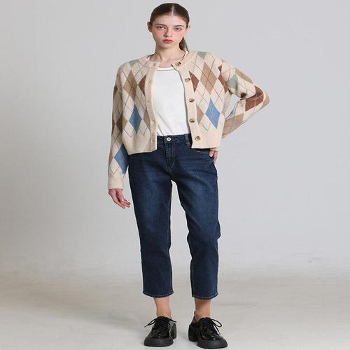 여성 아가일 패턴 니트 가디건 라운드넥 패션 카디건