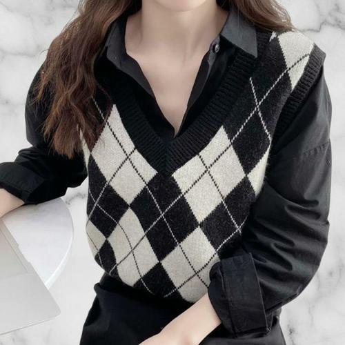 [신상오픈런]여성 브이넥 아가일 체크 패턴 니트 조끼 봄가을용