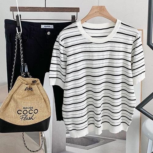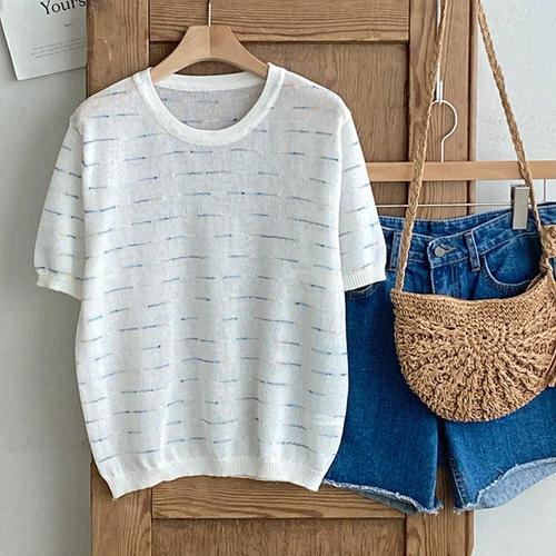 [샵앤][샵앤] 여성 라운드넥 단가라 여름 반팔 니트티 JR-WKN-4528-아이보리