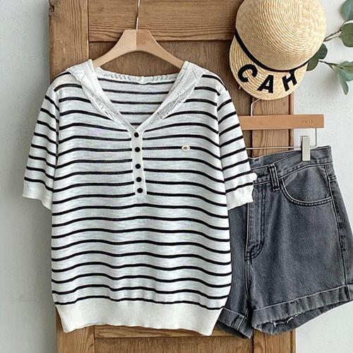 [샵앤][샵앤] 여성 반단추 오픈 시슬 후드 반팔 니트티 BONG-WKN-4501-S아이보리