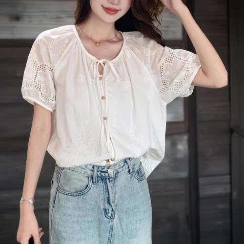 [신상오픈런]여성 아이보리 리본 장식 펀칭 꽃 자수 반팔 티셔츠