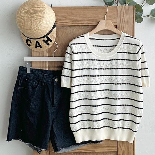 [샵앤][샵앤] 여성 라운드넥 단가라 물결 펀칭 반팔 니트티 BONG-WKN-4498-아이보리