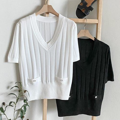 [샵앤][샵앤] 여성 V넥 레이어드 앞단추 포인트 왕골 반팔 니트티 BONG-WKN-4497-아이보리