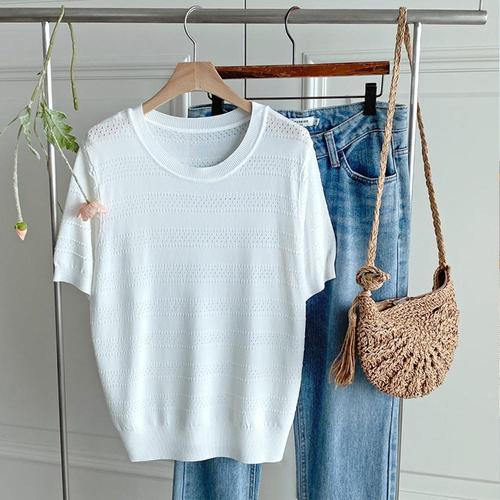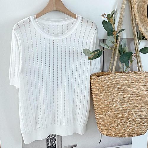 [샵앤][샵앤] 여성 라운드넥 펀칭 여름 반팔 니트 티셔츠 BONG-WKN-4494-아이보리