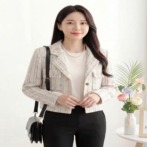 [샵앤]여성 노카라 클래식 심플 숏 탄탄 트위드 자켓 NYS-WJP-5147-아이보리