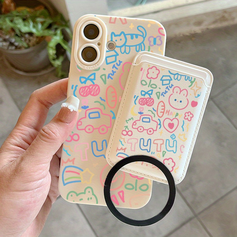 TEMU 폰 케이스: 아이폰 16 럭셔리 고급 가죽 충격방지 풀커버 컬러풀 심플 토끼 패턴 자석 폰 케이스 1개 + 고품질 인조 가죽 자석 카드 클립 1개 (1-3장 신용카드, 신분증, 카드 수납 가능) - 아이폰 15 14 13 12 11 Pro Max XS XR 7 8 PLUS SE KM1 호환