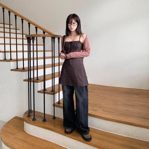 [옷자락]여성 코튼 스판 체크 리본 어깨끈 미니 원피스