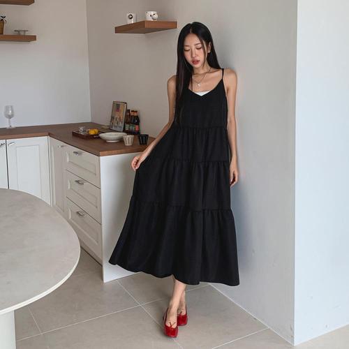 [다잇템]여성 핀턱 티어드 롱 잔주름 SS 어깨끈 원피스