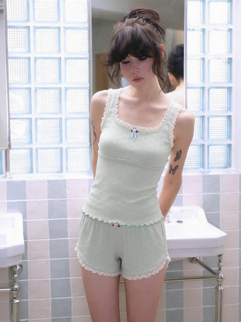 [언더띵] 장미 모티브 하트 자카드 면 캡 탈부착 슬리브리스 브라 티셔츠+반바지 세트