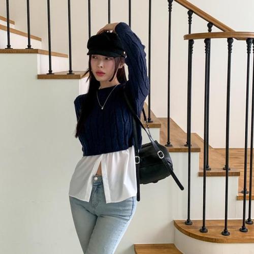 [옷자락]여자 FW 그런지 크롭티 언더붑 꽈배기 롱슬리브 니트