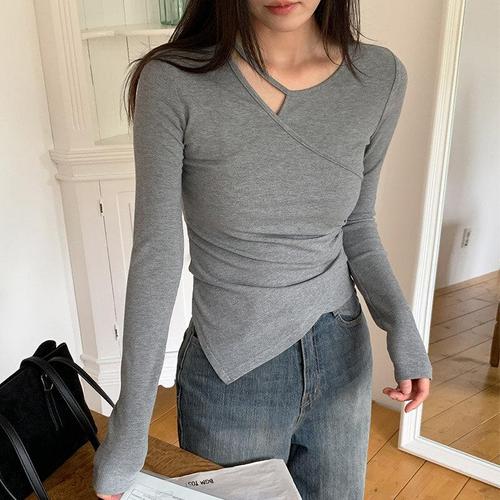 1+1 여성 긴팔 티셔츠 캐주얼 가을 겨울 도톰 이너 상의 슬림핏 긴팔티 기질 여자 언발란스 티셔츠 WXY