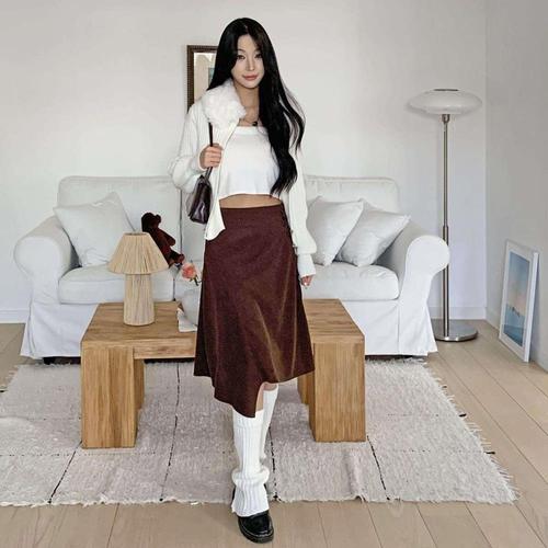 여성 포인트 언발 골덴 중간 버튼 스커트