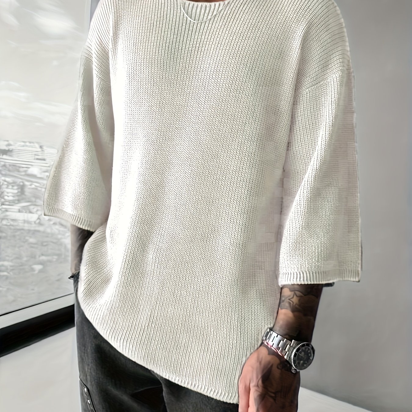 TEMU 남성용 새로운 유럽 및 미국 스타일 니트 스웨터. 라운드넥, 드롭 숄더, 반팔 디자인으로 캐주얼하고 다재다능한 풀오버 스타일입니다. 솔리드 컬러로 편안한 스트리트 스타일에 완벽합니다.|반팔니트