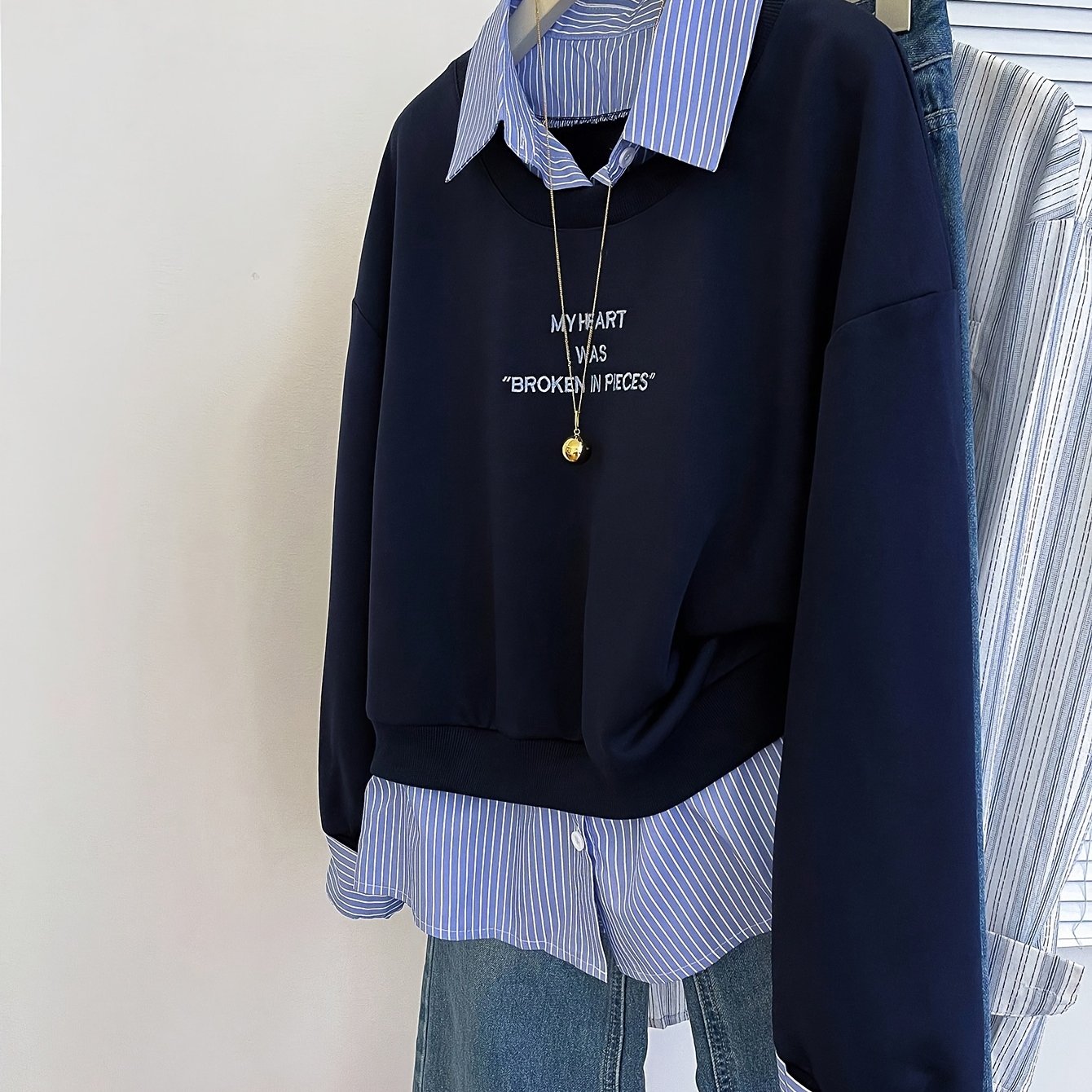 TEMU 컬러블록 셔츠 칼라 2-in-1 룩 스웨트셔츠 여성용 새로운 루즈 풀오버 캐주얼 탑|블라우스|셔츠|옷