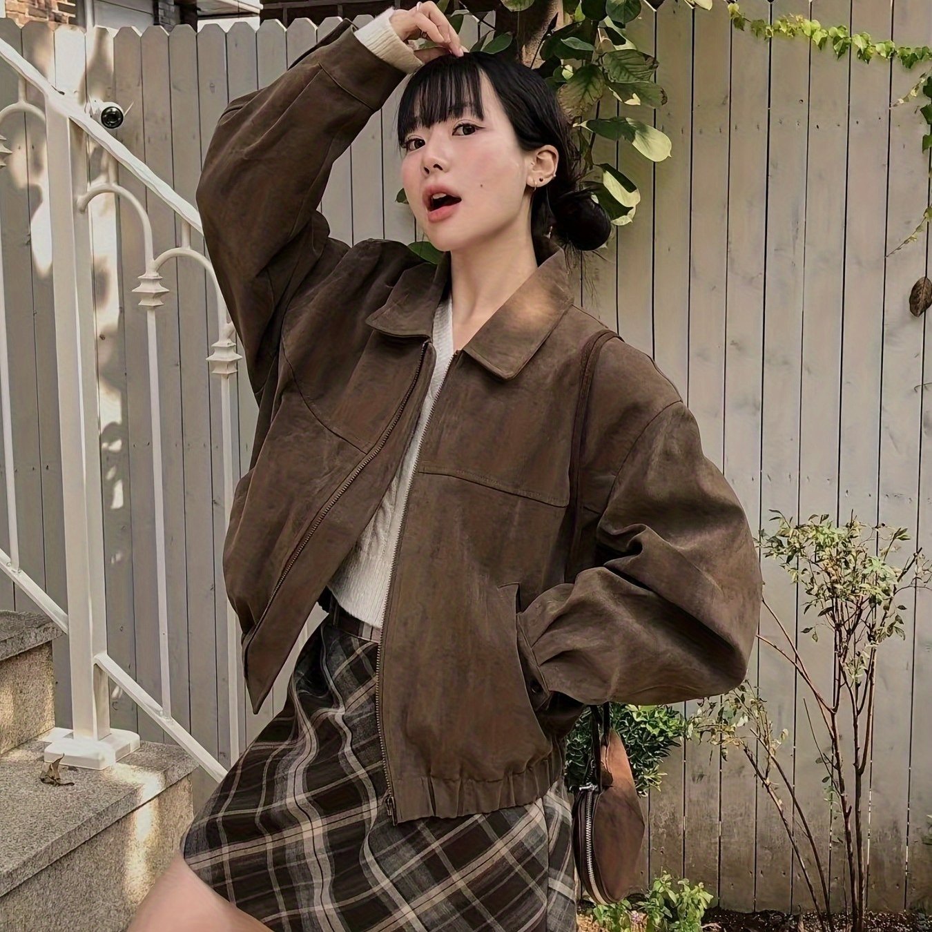 TEMU 한국 INS 스타일 가을-겨울 신상 레트로 고급스러운 재킷 | 라펠 칼라 및 지퍼 디테일이 있는 루즈 캐주얼 인조 스웨이드 야구 재킷