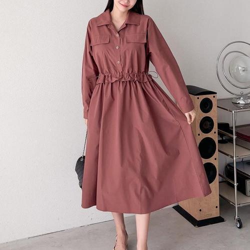 [다잇템]여자 가을하객룩 핀턱 에이라인 단추 롱원피스 (18040523A)