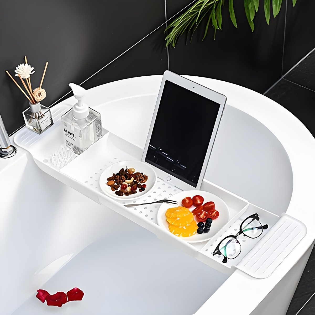 TEMU 확장 가능한 욕조 배수 트레이 - 욕실 정리 용품, 공간 절약 디자인, 인간 중심 핸들, 12 파운드 용량, 샤워 캐디 및 욕실 정리 용품에 적합, 욕실 정리 용품 및 보관, 다용도 욕실 정리 용품, 현대적인 , 내구성 있는 플라스틱 트레이