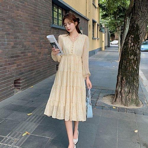 [오너클랜]인기상품 옐로우잔꽃 프릴 긴팔 플레어 셔링 롱 원피스 봄여름 데일리 드레스 [WFLLQQC_260305]