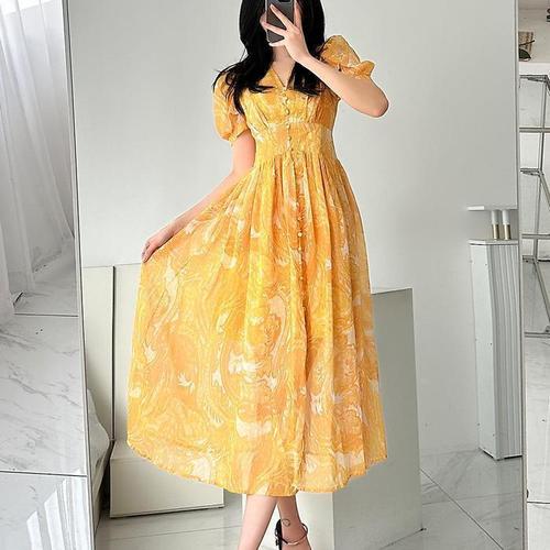 [다잇템]여자 펌킨소매 옐로우 콩단추 오렌지 롱원피스 (12158979A)