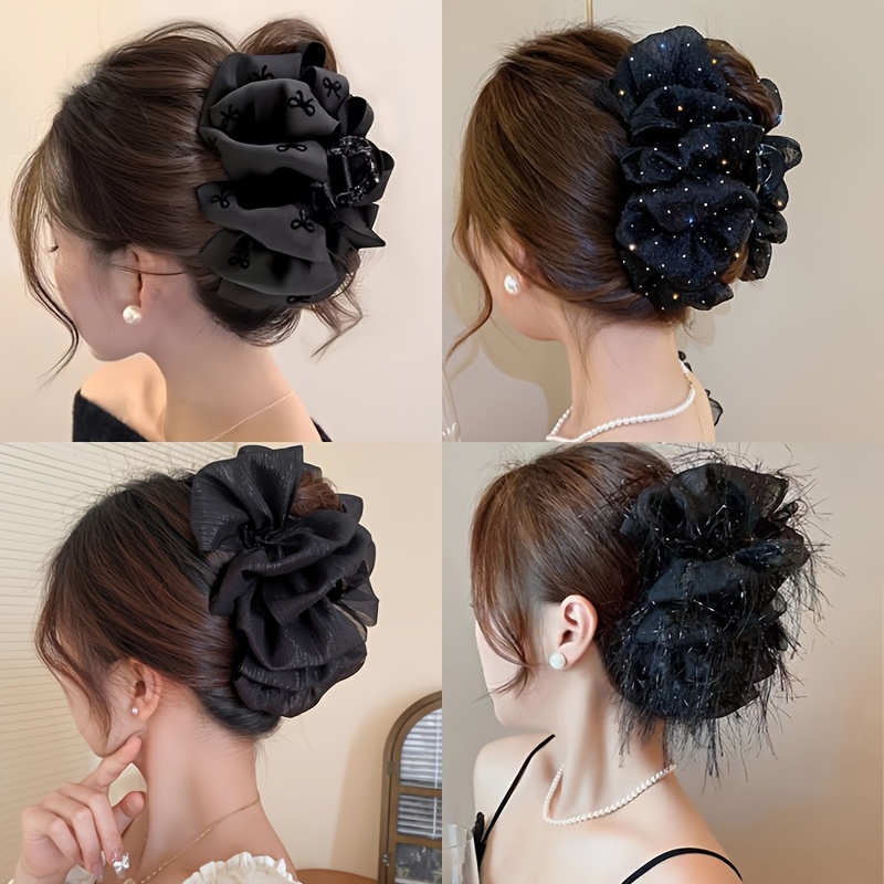 TEMU 4개 세트 우아한 블랙 버블 헤어 클로 세트 - 리본 프린트, 태슬, 실버 와이어 별하늘 헤어 클립, 여성용, 데일리웨어, 파티, 웨딩 및 기타 행사에 적합