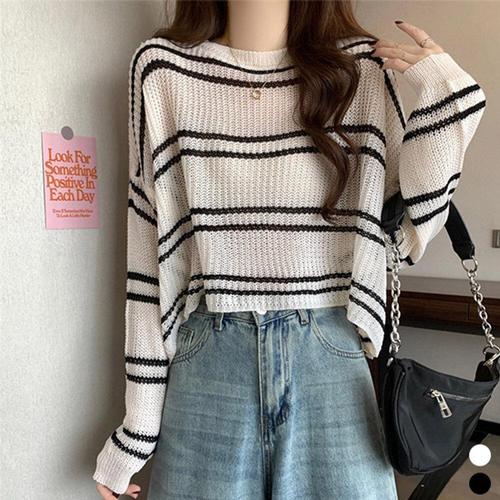 [기타브랜드]시스루 크롭 스트라이프 니트 루즈핏 그물 여름 블랙 여성 긴팔