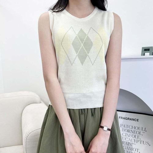 [옷자락]여성 브이넥 아가일 니트 조끼 봄 여름 베스트